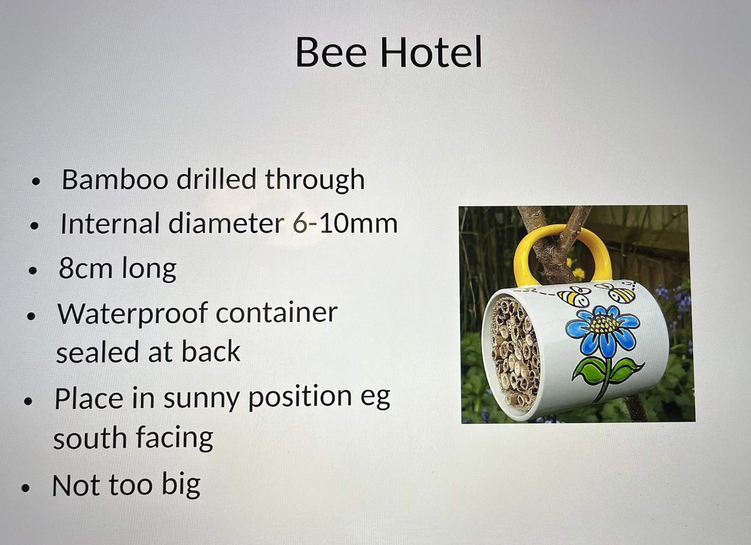 You can easily make a bee hotel, either from a 2 pint milk container cut down, or an old mug and bamboo canes.